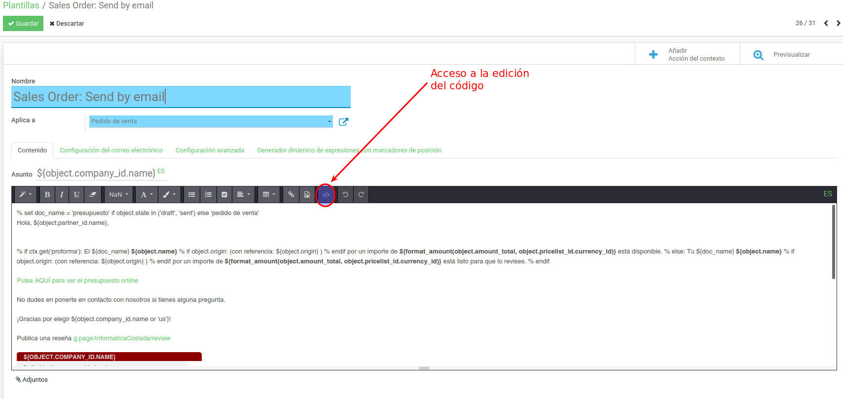 Pulsando en el símbolo "<>" accedemos al código HTML que contiene la estructura del email.